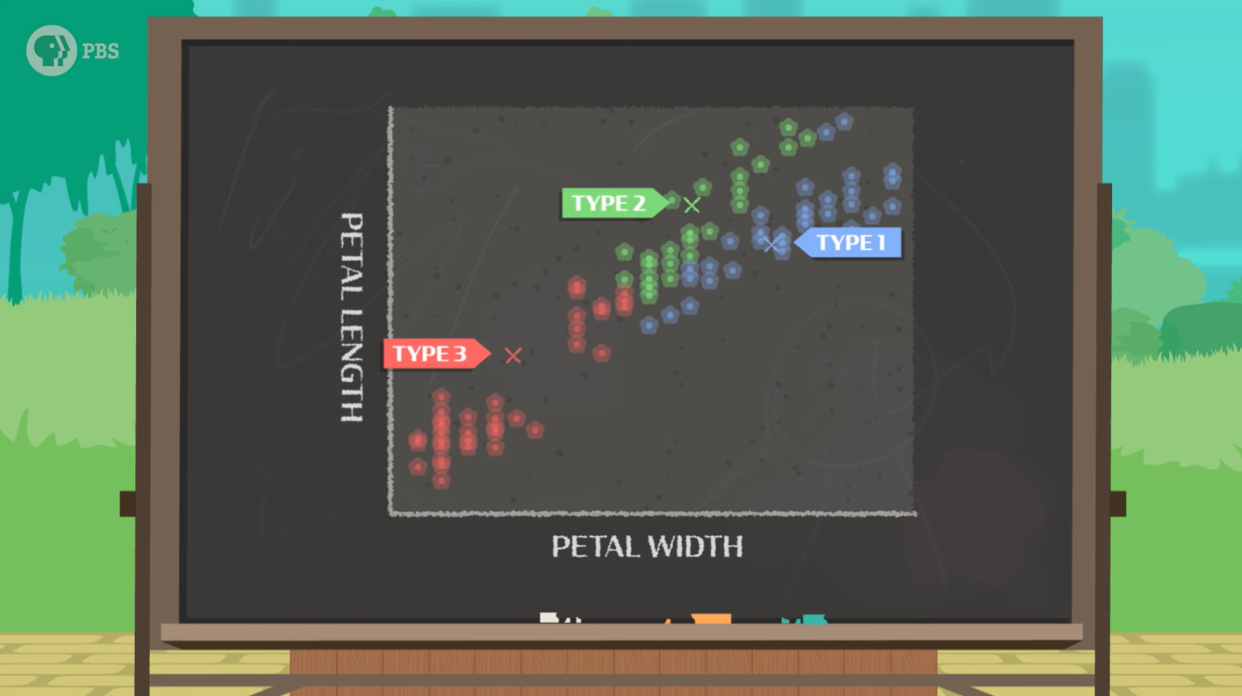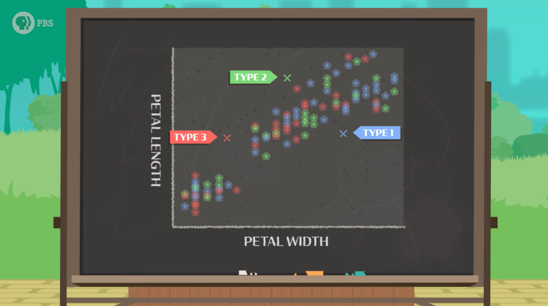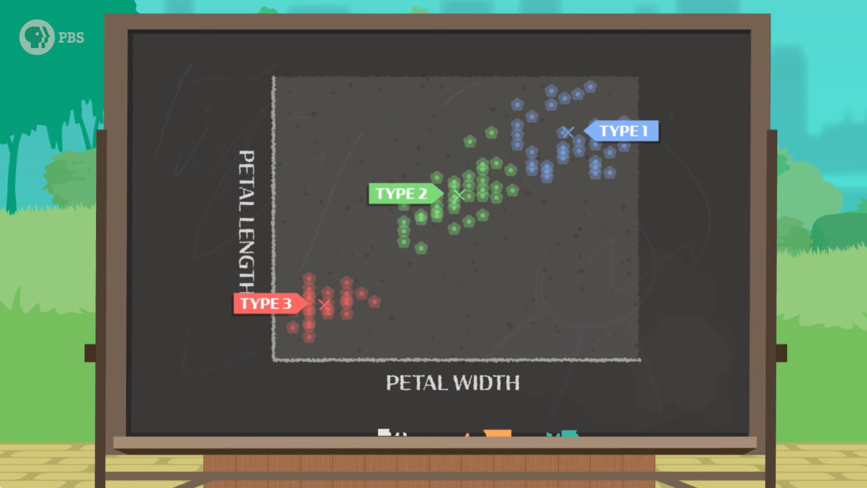 一开始,我们得先指定模型应该寻找多少个聚类。这将成为模型对世界的初始理解,例如,我们正在寻找 K=3 的平均值(三种类型的鸢尾花)。于是图表中每一个数据点(意味着一朵花)都会被随机标记为是类型1,类型2,还是类型3,接着模型会进行纠正,每个数据点簇的平均值应该位于中间,因此模型会通过计算新的平均值来自我纠正。经过多轮的预测、纠正、预测、纠正,最后完成分类。