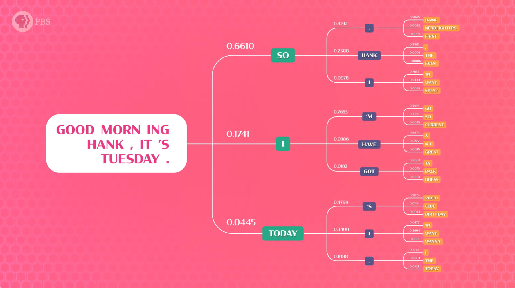 我们通常认为模型输出的是一个标签或预测,但实际上,神经网络会生成一系列分数或概率。最有可能的词具有最高的概率。因为我们在每一步都会得到概率,所以我们不必每次都选择最佳概率来生成一个句子,而是可以抽取3个词,并生成3个新句子。这3个句子中的每一个都可以生成3个新句子……然后我们就得到了一个可能性的分支图。