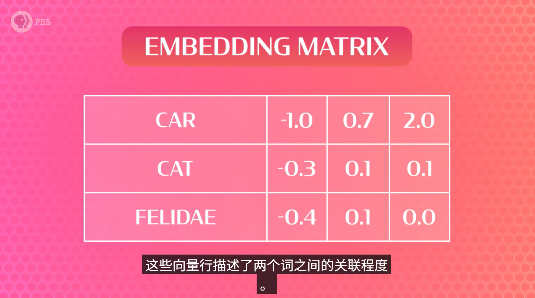 嵌入矩阵是一个包含大量向量的列表,本质上是一个包含大量数字的表格,其中每一行对应一个不同的单词。这些向量行记录了两个单词之间的关联程度。这意味着如果两个单词的用法相似,那么它们在向量中的数字应该相似,但是,一开始这些都是随机的。在我们的嵌入矩阵里,单词变成了索引,索引又变成了向量。