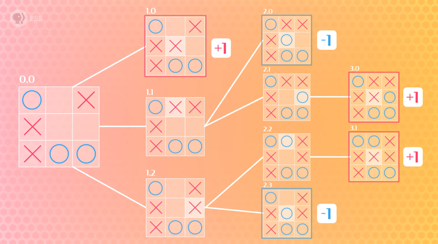 让AI下棋,本质上是把棋盘当作一棵状态树,每种选择结果都可以被赋予一个奖励(例如,获胜为1,失败或平局为-1)。AI需要搜索遍历所有可能的结果树来找到获胜的路径,它要么选择最大化自己回合获胜结果的分支,要么选择最小化对手回合获胜结果的分支,这称为 极小极大算法(minimax algorithm)。该算法会根据每一步棋的概率赋予一个值,AI再根据自己的策略决定下一步怎么走。