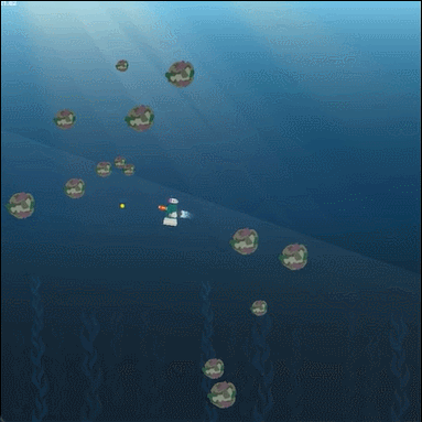 我们将玩一个《垃圾爆破者》游戏,玩家的目标是扮演一个机器人在海洋中游泳,并摧毁垃圾,注意不能碰到垃圾,否则就会输掉游戏。之后,我们将训练我们的AI,让AI学会玩这个游戏(游戏的制作过程请参考配套代码,这里着重讲解训练AI的部分)。
