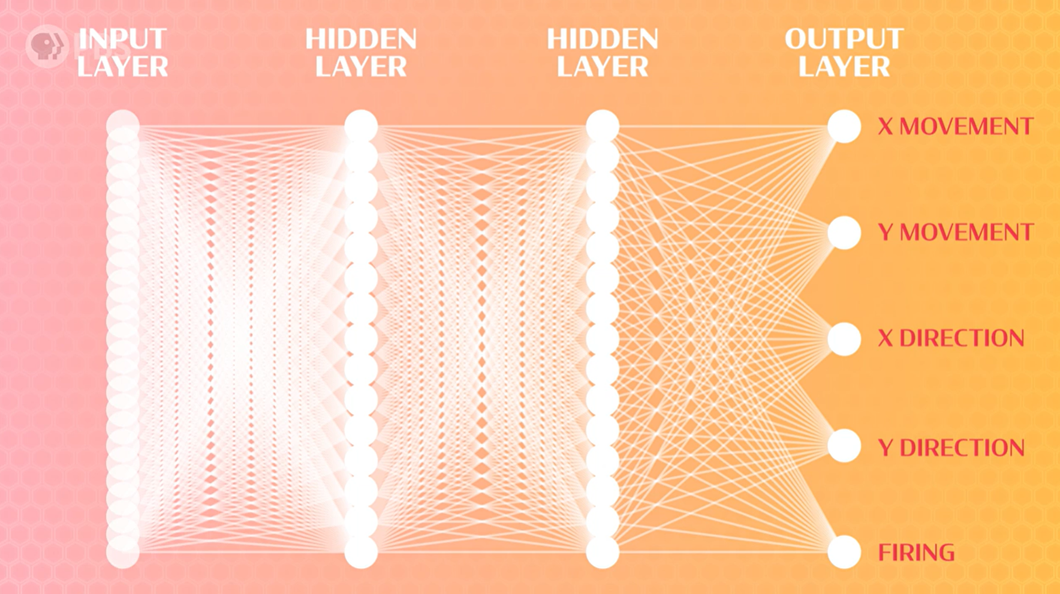 对于输出层,总共会有5个节点:一个用于移动的 X 和 Y 坐标节点,一个用于瞄准的 X 和 Y 方向节点,以及一个用于决定是否发射光束的节点。