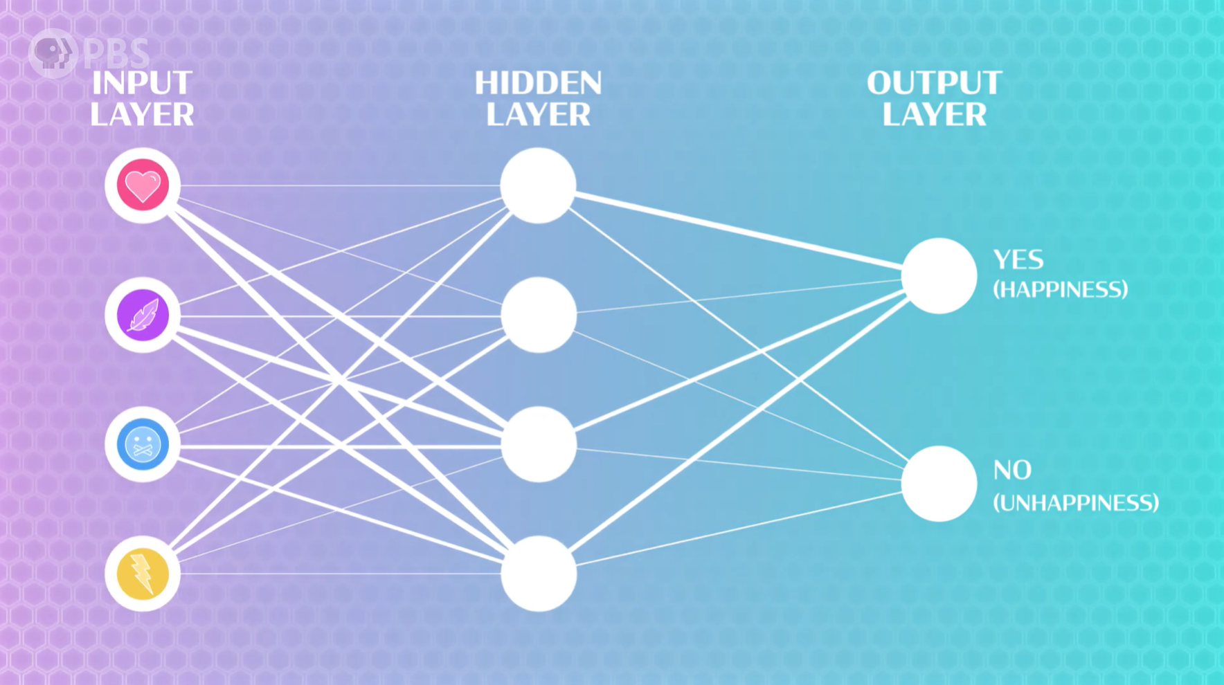 我们依然使用 多层感知器神经网络(MLP),这个神经网络有一个用于接收上述4个特征的输入层,以及若干个隐藏层(用于寻找特征之间的关系,帮助模型做出准确的预测),最后还有一个输出层(输出是否带来快乐)。