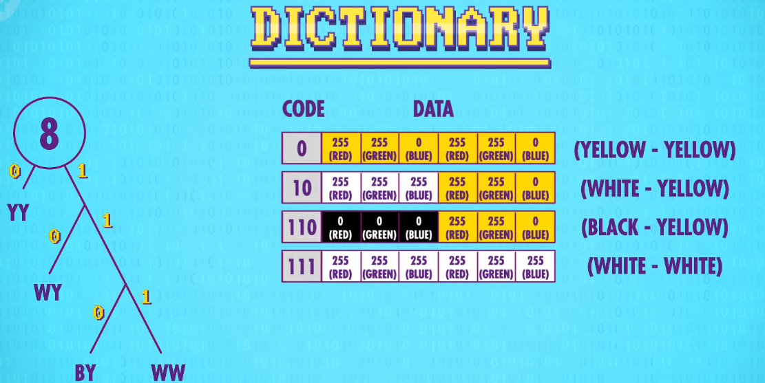 前面提到,位图文件存储的是RGB数据,有时候一张图片很大,而我们想更快地把它发给朋友,这时候就需要用到 压缩(compression),一种简单的压缩方法是游程编码,例如连续7个像素点都是黄色,与其用7个一样的RGB数据,不如在前面加个7代表7个,再接1个RGB数据即可。这种压缩方法适合经常出现相同值的文件,并且可以轻易地复原,叫做 无损压缩。1950年代,麻省理工学院学生哈夫曼发明了一种高效编码方式,叫做 哈夫曼树(Huffman Tree),将出现频率高的块用短编码,频率低的用长编码,用树结构和字典来映射。