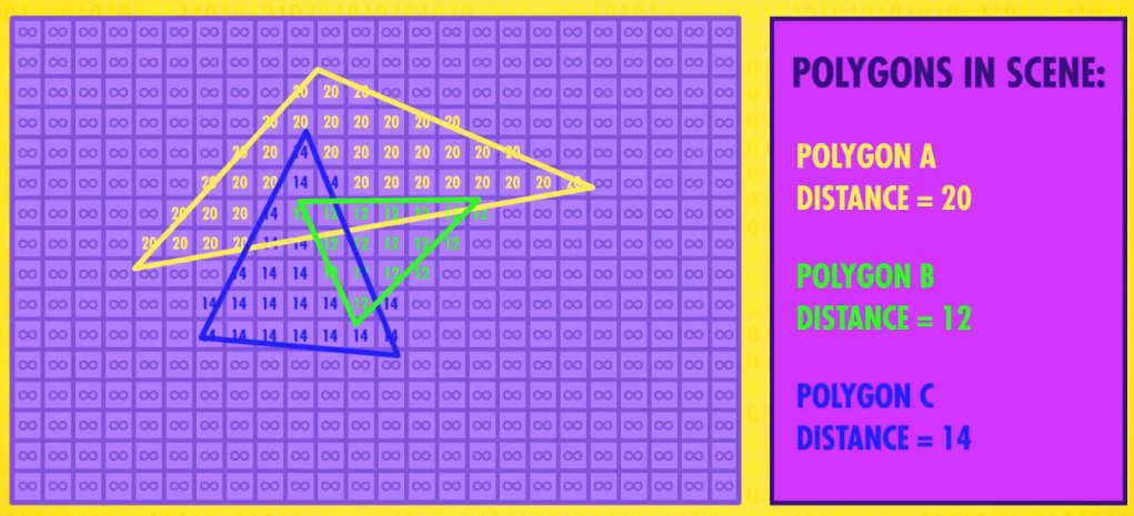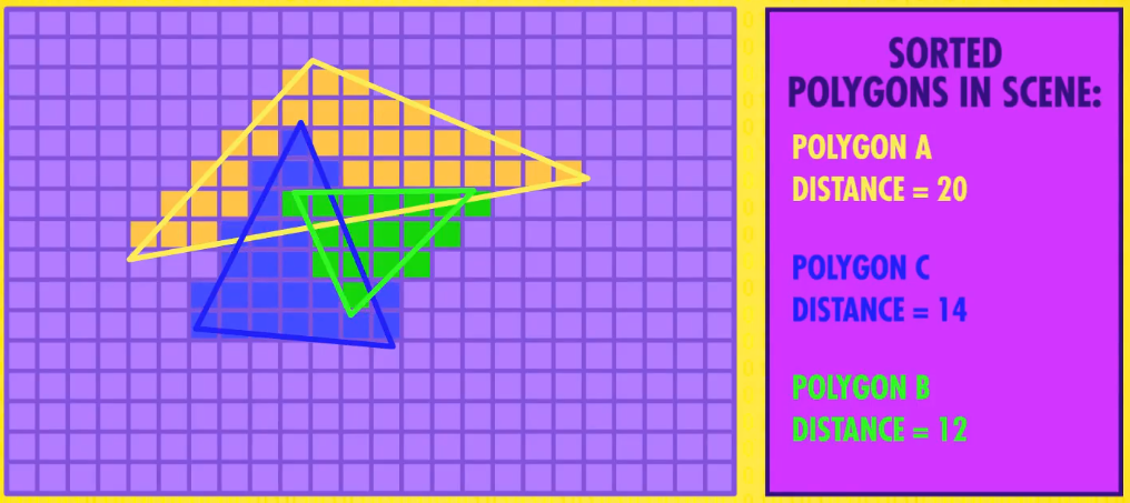 在 3D 场景中,经常有画面堆叠的情况。这叫 遮挡。常用 画家算法 来计算遮挡。先画远的,再画近的。再用扫描性渲染来填充。但是这种算法需要先对多边形的远近进行排序。