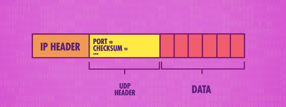 互联网是一个巨型分布式网络,大数据会被拆分成一个一个数据包传输。数据包的格式遵循IP协议,即在数据包的头部加上元数据注明要发给谁,但如果只有IP协议,对方不知道这是哪个应用程序需要的数据,于是人们在IP协议之上开发了更高级的协议。例如 用户数据报协议(UDP) 在数据前加UDP头,指明了端口号,端口号是应用程序访问网络时,需要向操作系统申请的识别号。总而言之,IP协议负责把数据包发给正确的计算机,UDP协议负责发给正确的应用。